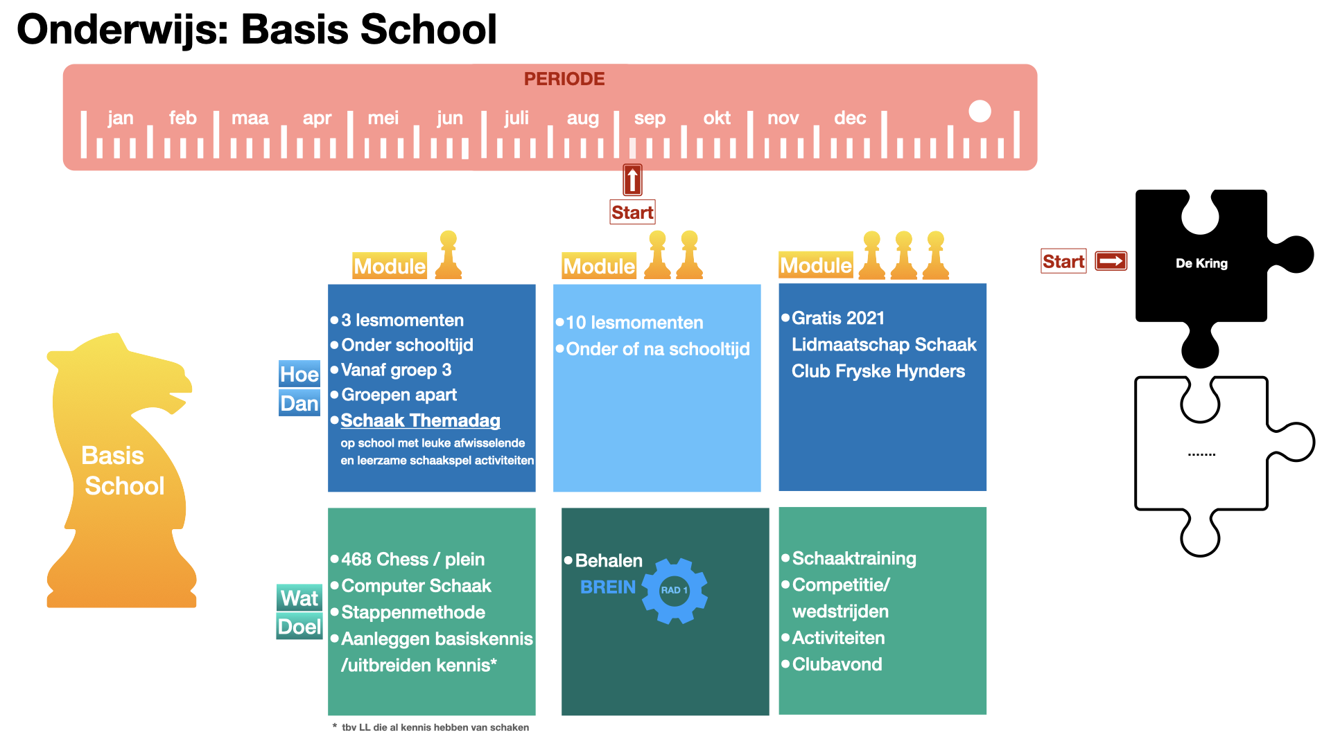 In 3 lesmomenten in Fase 1 ervaren kinderen hoe het is om met schaakspelletjes op het plein of gymzaal de basis te leren. Naast deze methode wordt ook de computer ingezet om al gamend het schaken te leren. Tot slot wordt er ook ervaring opgedaan met de klassieke stappenmethode.