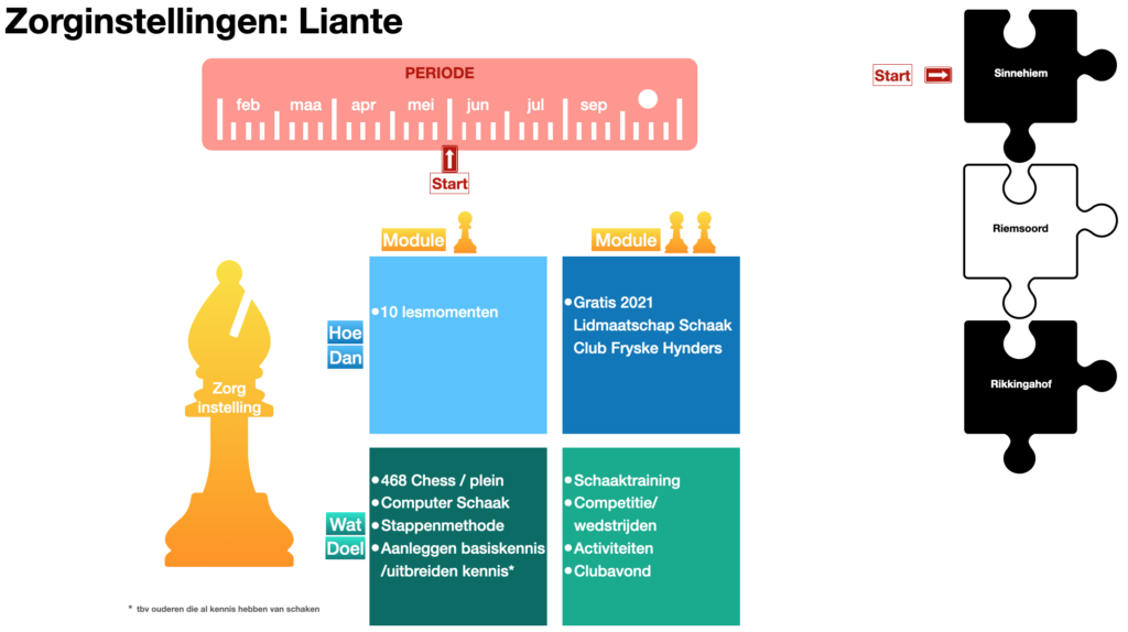 Vanuit de huiskamer of ander ruimtes kunnen ouderen deelnemen aan een serie schaaklessen. Onderdeel van de lessen zal zijn het oplossen van schaakpuzzeltjes maar ook het echte schaakspel komt ook aan bod.